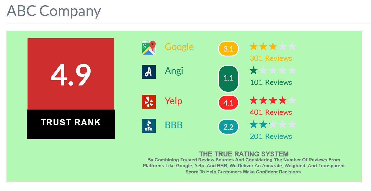 We combine review data from trusted platforms like Google, Yelp, Angi, and the BBB to produce a transparent, weighted score that helps you hire with confidence.